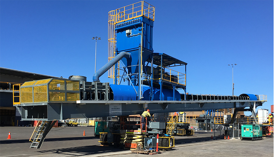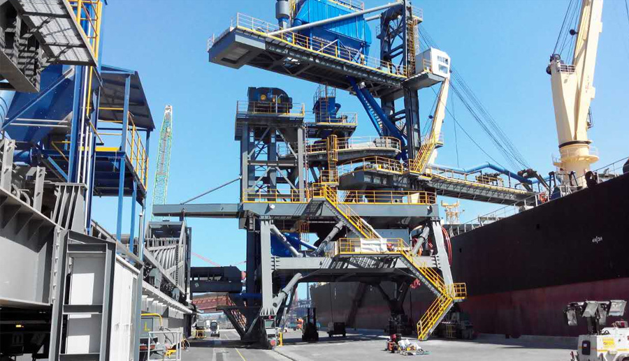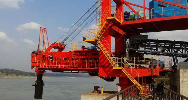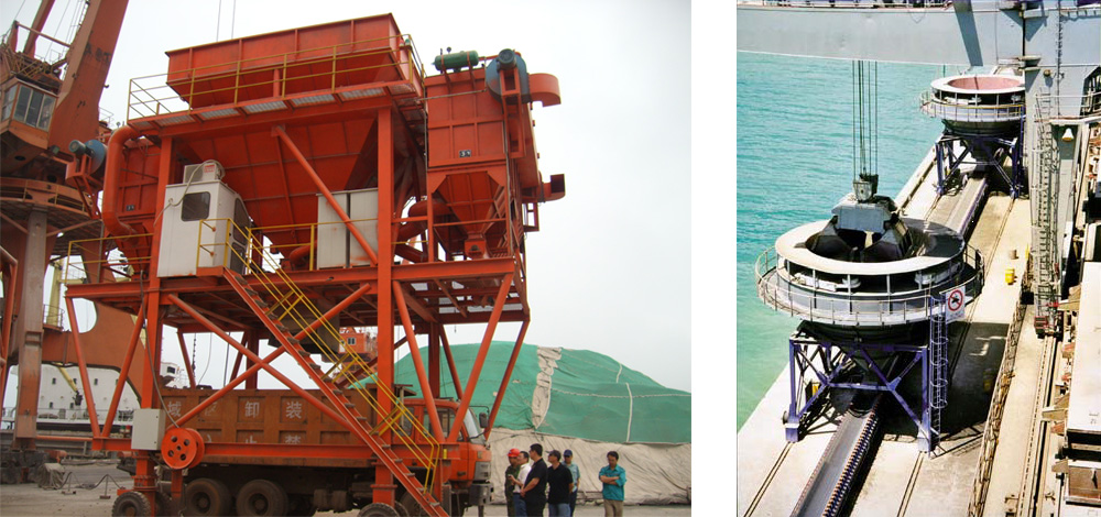 無軌道移動(dòng)式裝船機(jī),行走裝置有輪胎、履帶兩個(gè)系列,物料進(jìn)入裝船機(jī)的方式有:1)自卸卡車直接倒料的進(jìn)料裝置,每套進(jìn)料裝置的接受能力為625m3/h,弧形懸臂式可配置兩套進(jìn)料裝置,裝船能力達(dá)到1200m3/h,塔式可配置四套進(jìn)料裝置,裝船能力達(dá)到2400m3/h;2)裝載機(jī)進(jìn)料的料倉;3)皮帶機(jī)進(jìn)料的料斗。有軌道移動(dòng)式裝船機(jī),如圓弧軌道式、直線軌道式、前直線軌道擺動(dòng)和后直線軌道擺動(dòng)。對(duì)于水文落差較大的碼頭,采用在浮式躉船安裝1-2臺(tái)圓弧軌道式,直線軌道式需要配置相應(yīng)的尾車輸送機(jī),擺動(dòng)式裝船機(jī)適用于環(huán)保要求較高的碼頭,采用大跨距的回轉(zhuǎn)橋架,完成長(zhǎng)大艙口的覆蓋面積。對(duì)于船型很小或移船方便的碼頭,為減少投資,可選用墩座式裝船機(jī)。袋包裝船有螺旋滑槽式和托輥式。