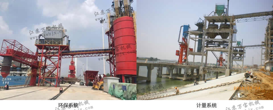 計(jì)量系統(tǒng):有2個(gè)計(jì)量倉(cāng),裝料、稱重、放料、稱重循環(huán)進(jìn)行,每個(gè)計(jì)量倉(cāng)有收塵器,通過(guò)調(diào)節(jié)流量閥和開(kāi)關(guān)閥由斜槽到裝船機(jī)裝船。